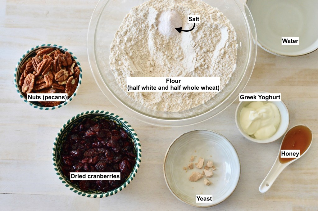 * Notes: For the flours, always aerate and mix the flour before measuring and weighing. I recommend that you weigh the flour and not only measure it in cups. You should have a total of 432 grams of mixed white and whole wheat flour. For the cranberries, preferably choose dried cranberries (or other dried berries) with no added sugar. For the Greek yoghurt, check the expiry date on packaging and for indications about containing live cultures or probiotics ( e.g. Lactobacillus bulgaricus and Streptococcus thermophilus). I haven’t tried this recipe with reduced fat or with plant-based Greek yoghurt (e.g. Soy based), but I think these could work just as well.