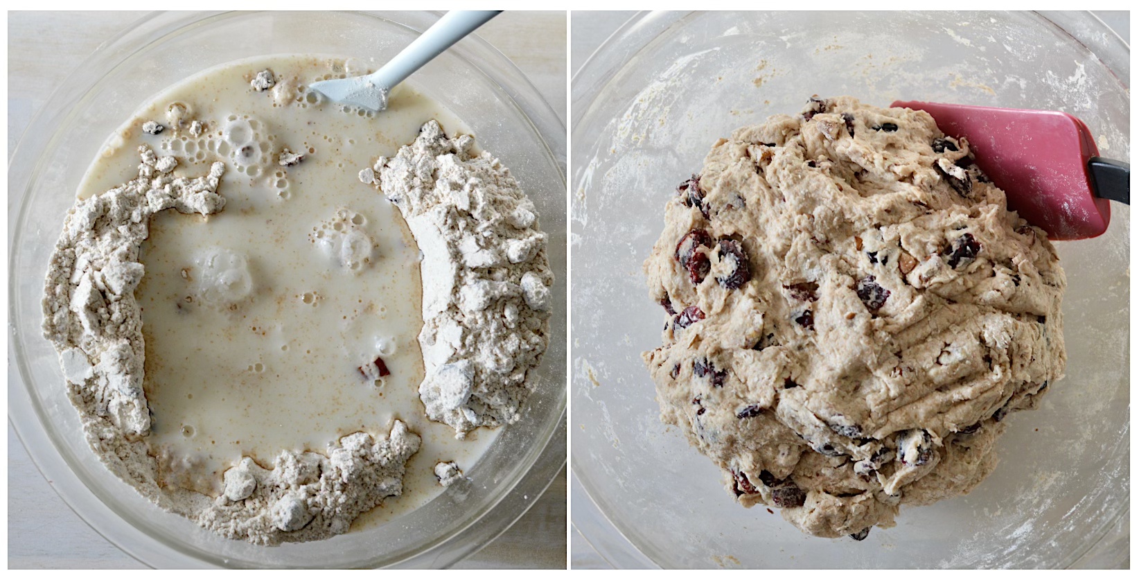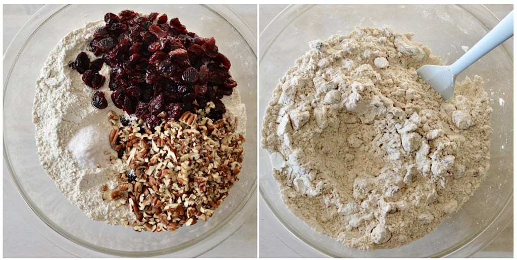 In a big bowl, mix together the flours, salt, dried cranberries and chopped nuts.