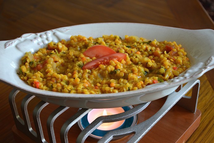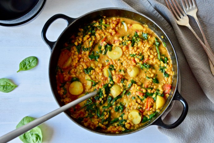 Made with dry red football lentils, ripe tomatoes, small tender potatoes and lots of fresh spinach leaves, this fragrant dal is a healthy, simple meal in one pot. Once your potatoes have been partially cooked in the microwave for 2 minutes and your ingredients are measured and ready to go, it can be made in […]